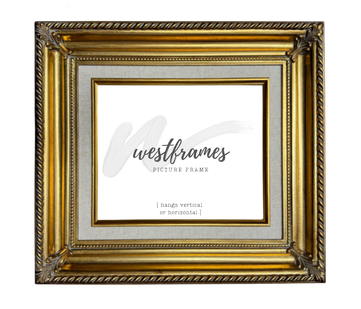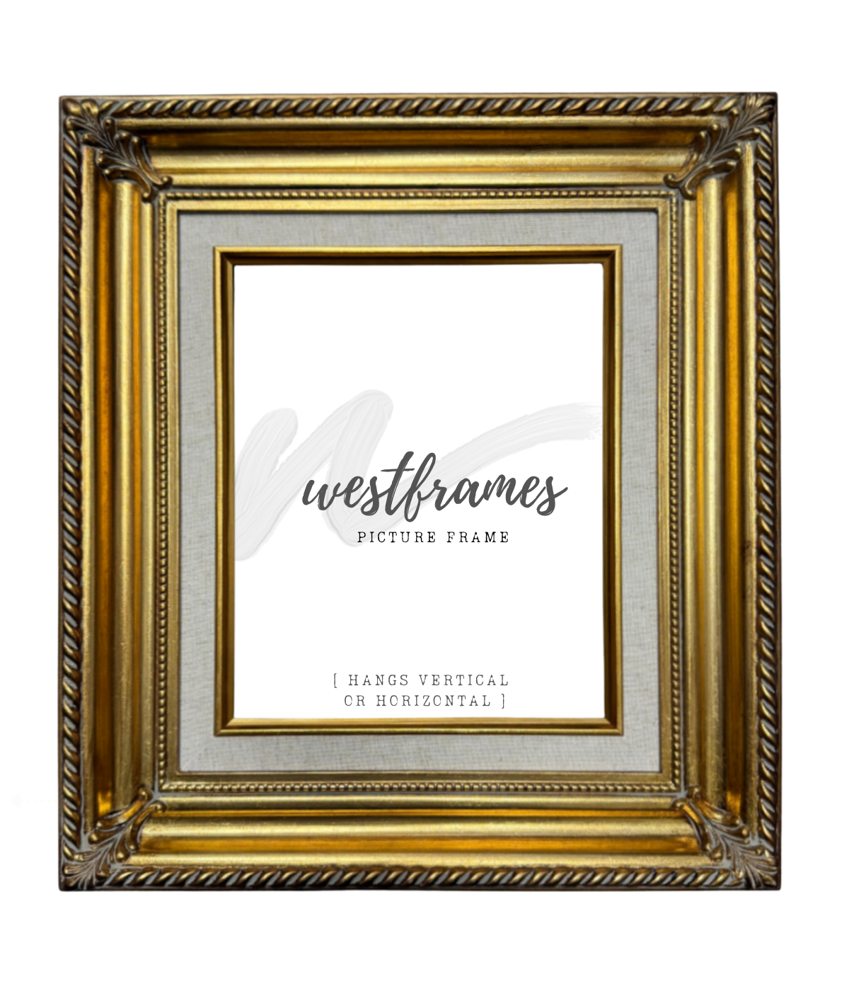 Drawing inspiration from the flair of the 1920s, the Gatsby Wood Picture Frame resonates with a refined vintage style. Its wooden frame, with gold leaf accents and decorative rope trim, is the perfect canvas for your treasured painted canvases, wedding photographs, oil paintings, and artwork- available in multiple sizes.
